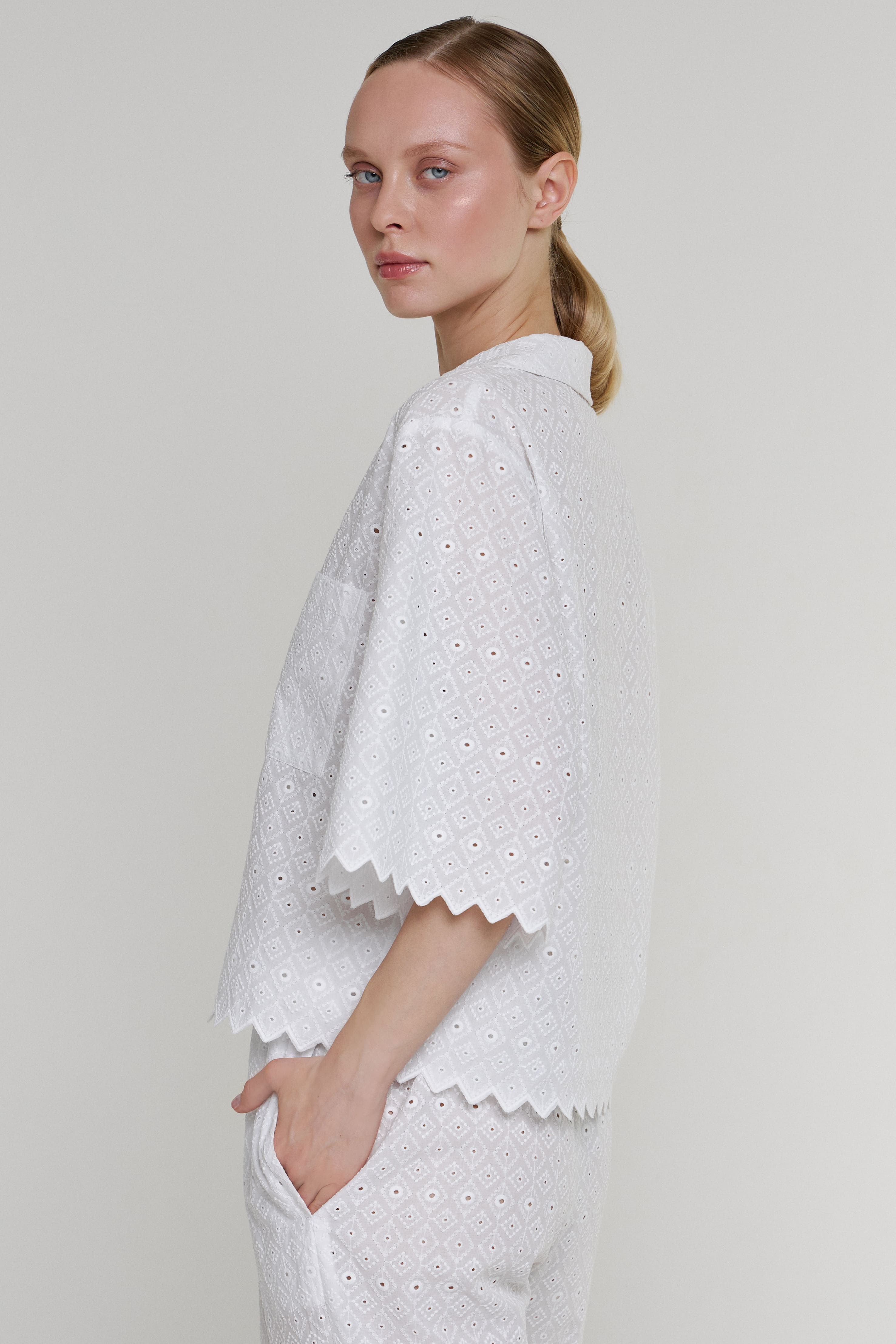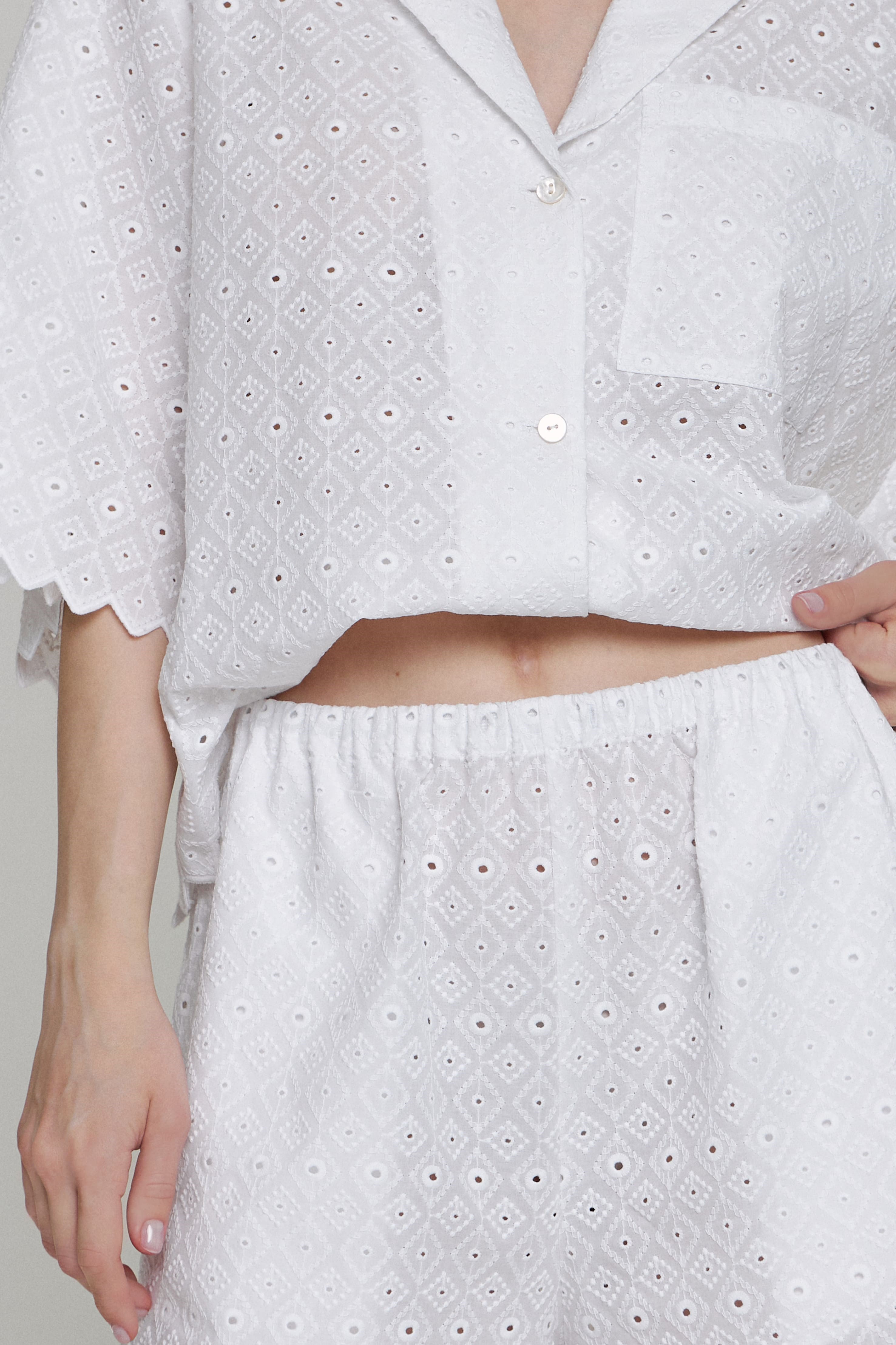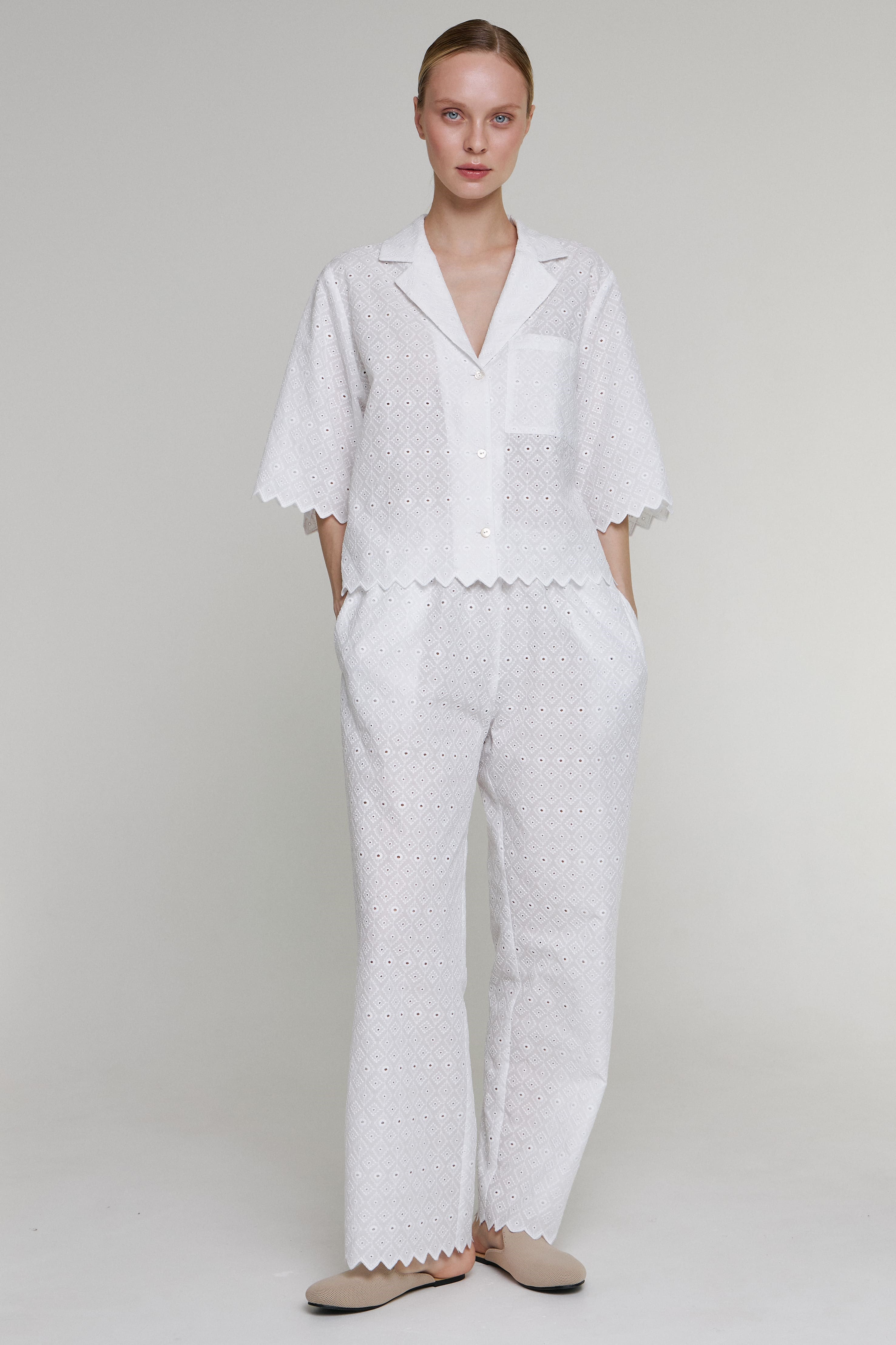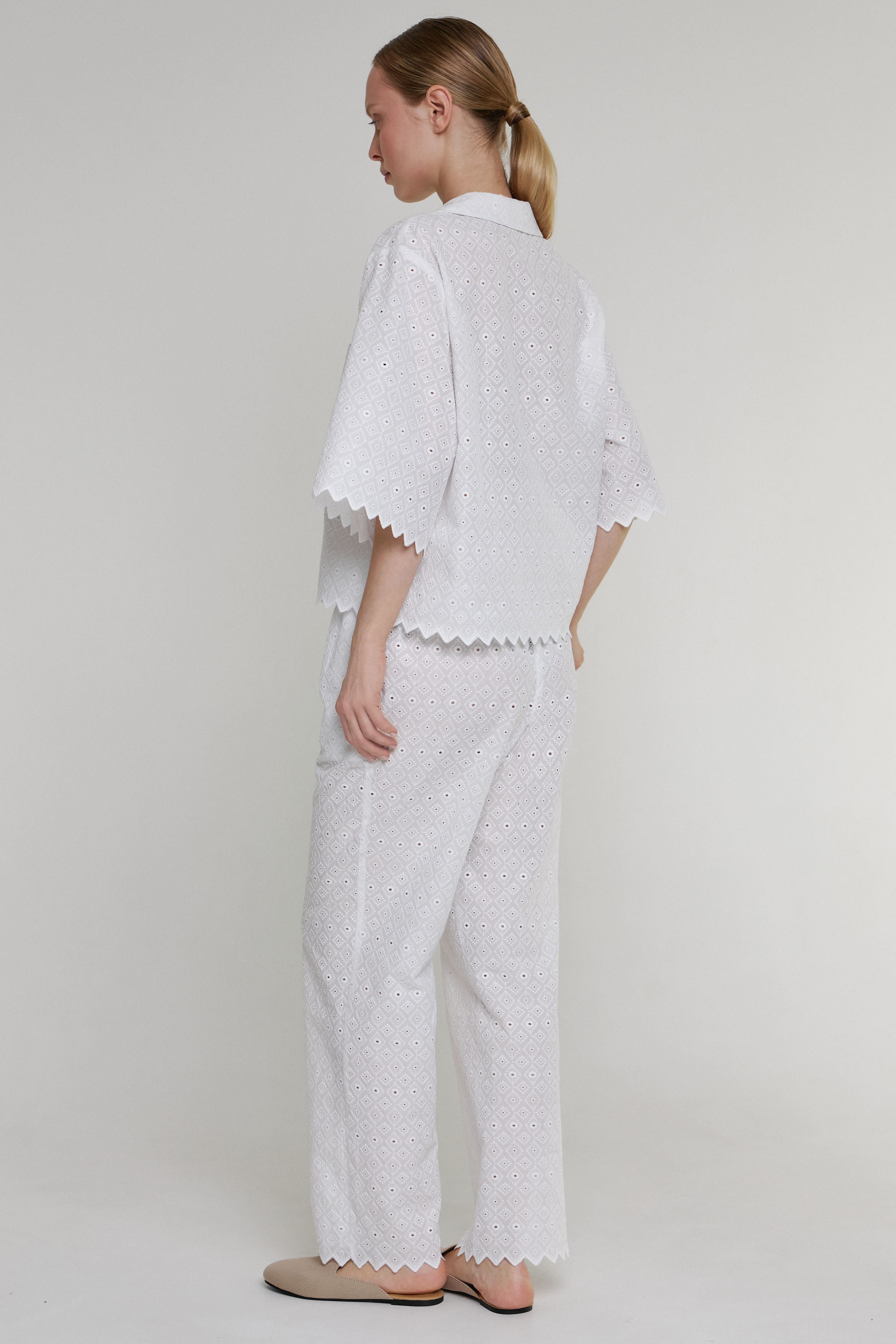 Свободные брюки на кулиске, с боковыми карманами, из хлопкового материала с изящным рисунком, выполненным в технике шитье. Модель подойдет как для стритовых и пляжных образов, так и для дома.