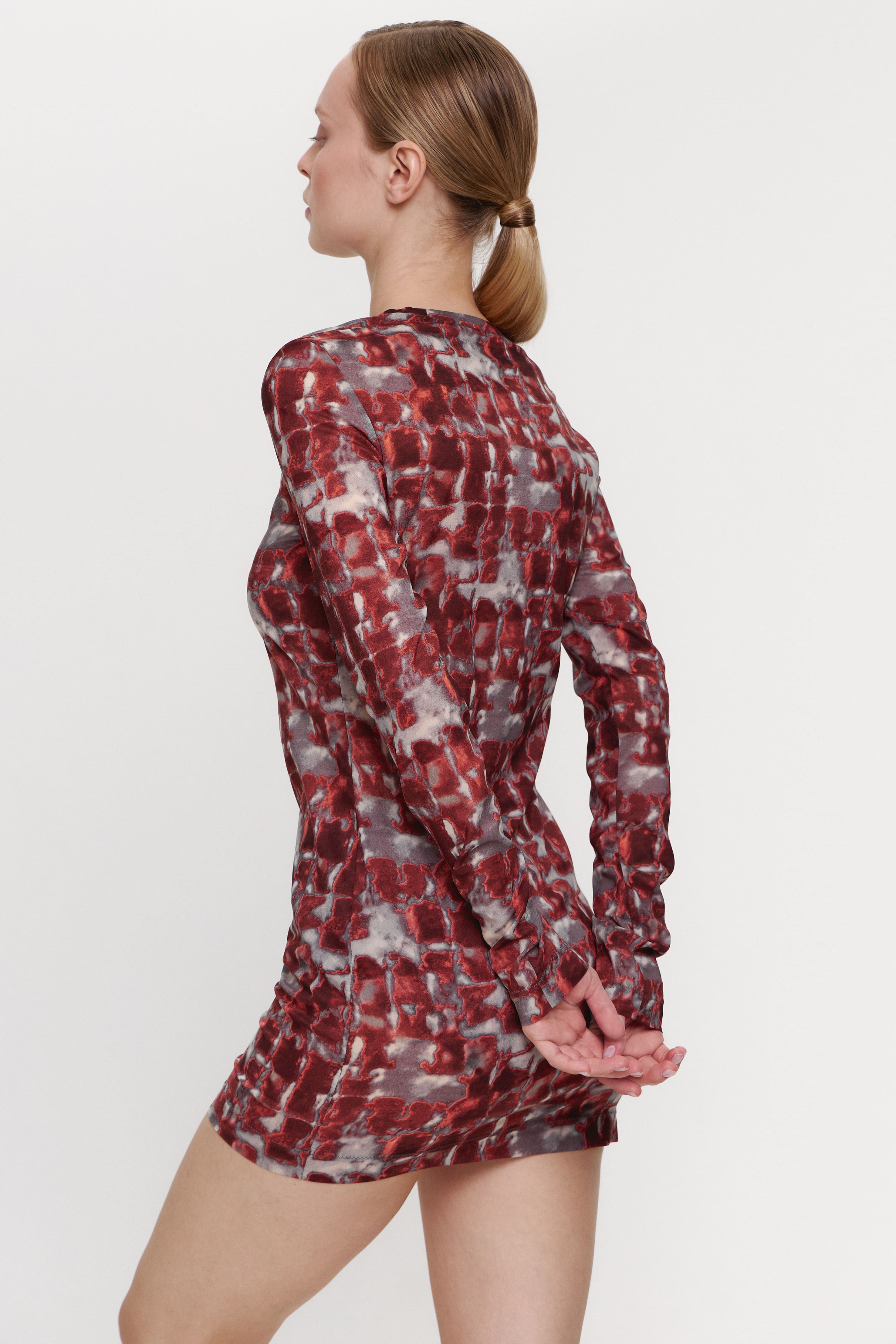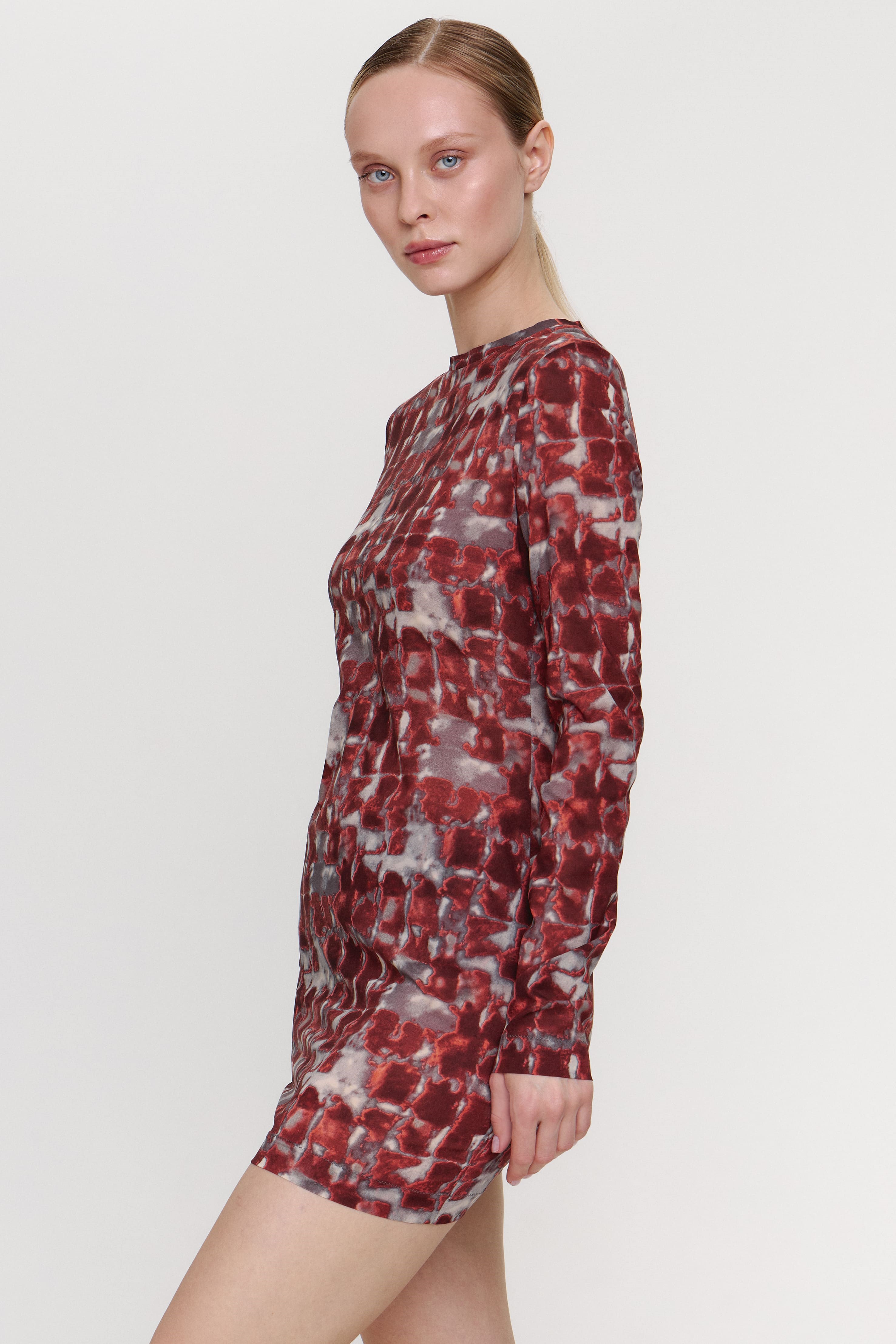 Платье Rosso Francia, из эластичного шифона с натуральным шелком. Полуприлегающий силуэт, длинный рукав. Обтачка из основного материала по горловине изделия.
