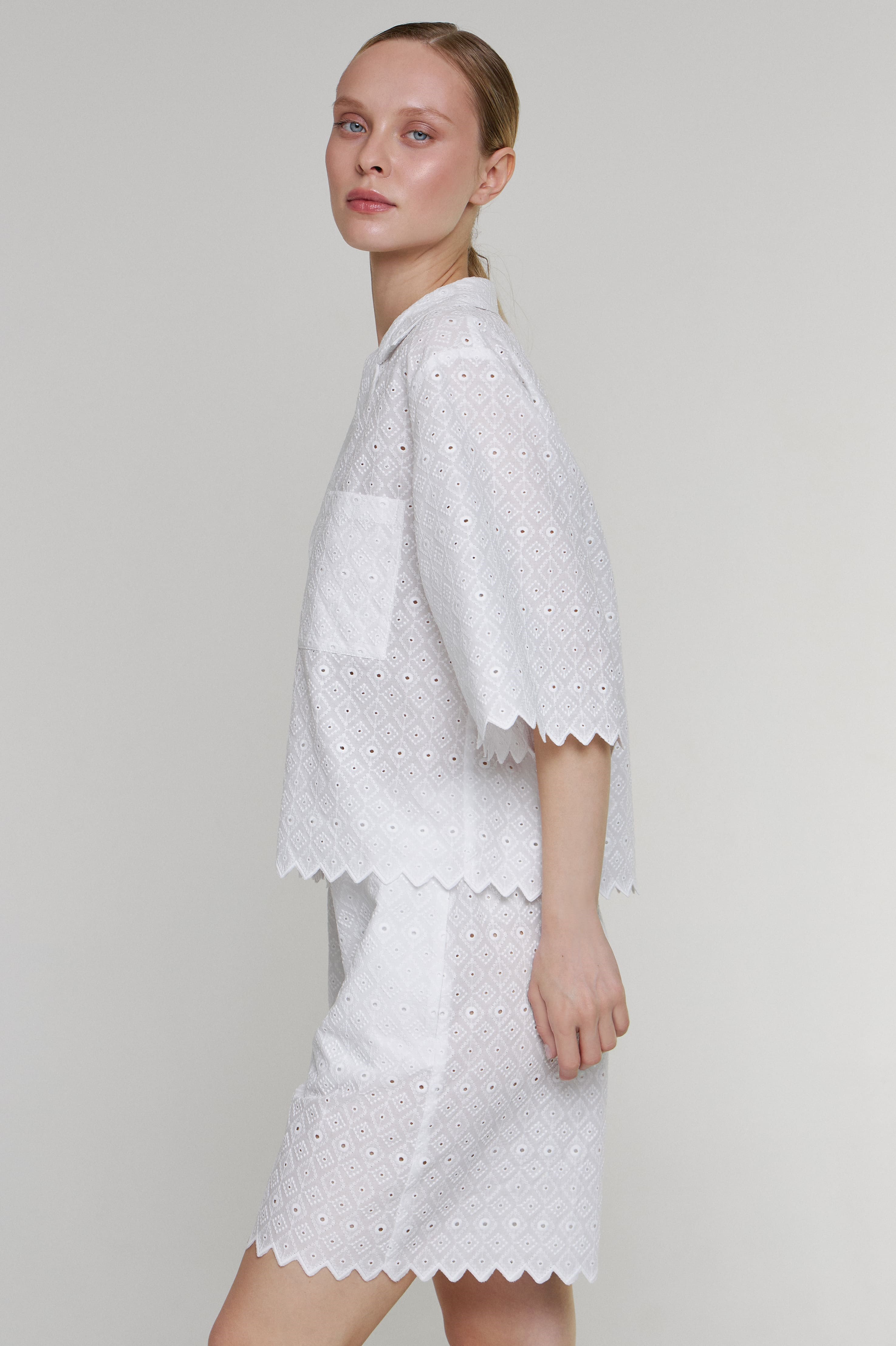 Свободные шорты на кулиске, с боковыми карманами, из хлопкового материала с изящным рисунком, выполненным в технике шитье. Модель подойдет как для стритовых и пляжных образов, так и для дома.