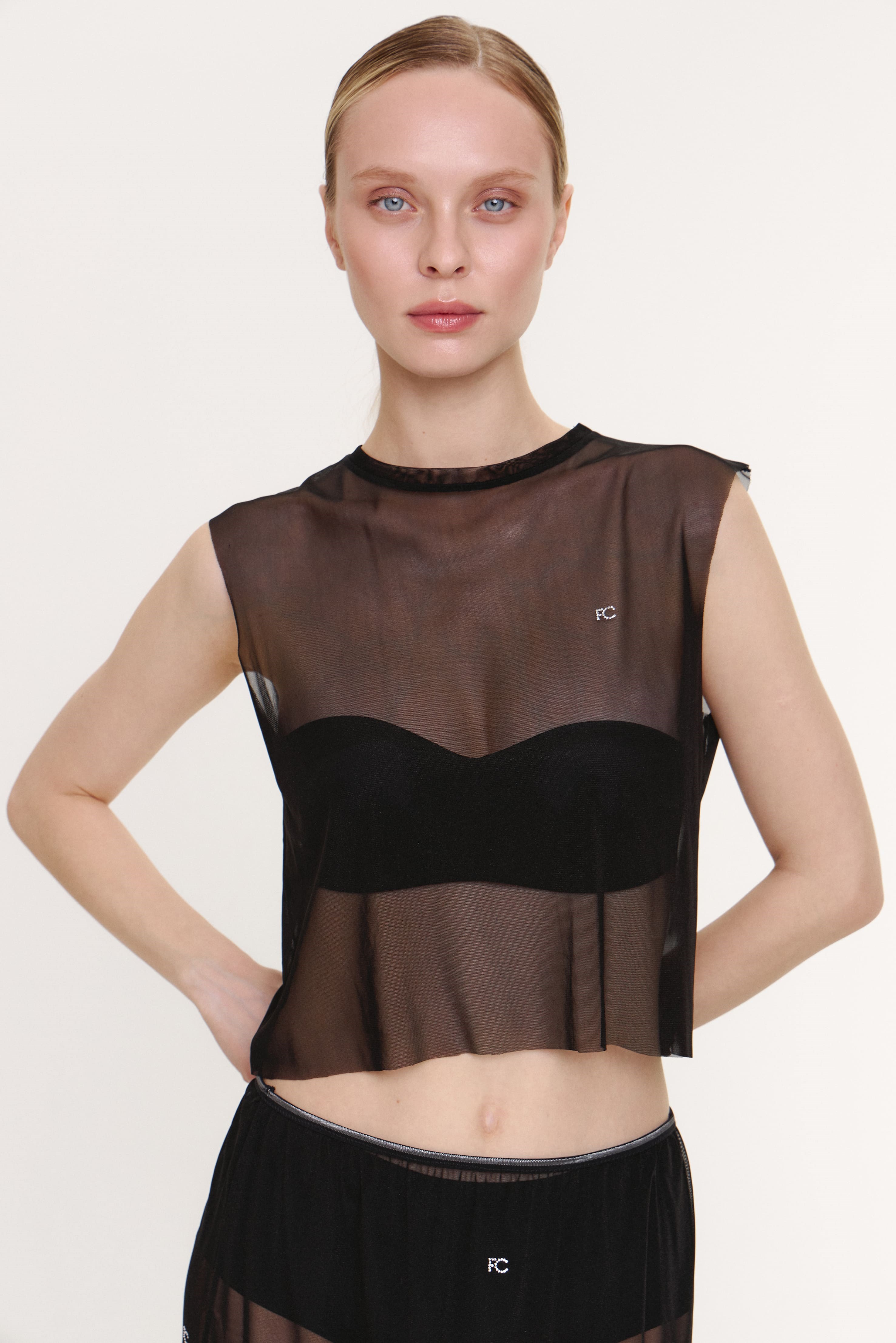 Модель выполнена из роскошной итальянской сетки с монограммами из кристаллов Сваровски. Края проймы и низ изделия выполнены технологией лазерной резки, горловина обработана обтачкой из основного материала.